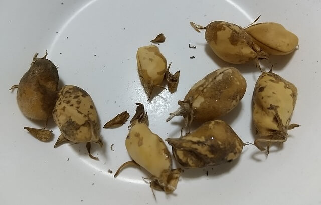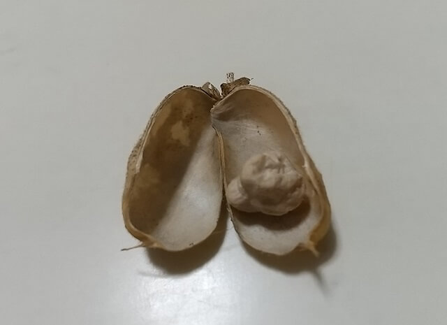 発育状態が悪く1粒しか入っていない。さやだけで中身が空のものもある。