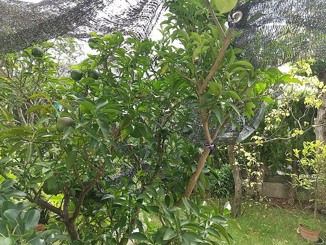 こっちは柚子。柚子は植木鉢が陶器で重く動かせないのでダイソーの遮光ネットを掛けています。微妙に足りてないんだけども、こちらも効果があったようで葉が元気っぽい。隙間が多いので蝶が入ってきますけどね~。