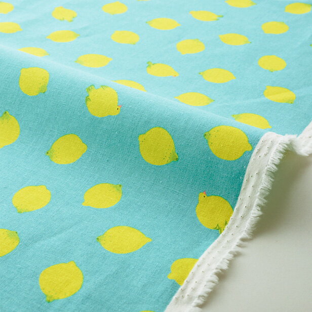 使用生地はおすすめ生地を紹介した中から選んでもらった綿麻キャンバス、その名もTori Lemon。レモンの中に鳥さんが居ます。これのポーチ作ってる人が居てすごくかわいかったんですよねぇ。
